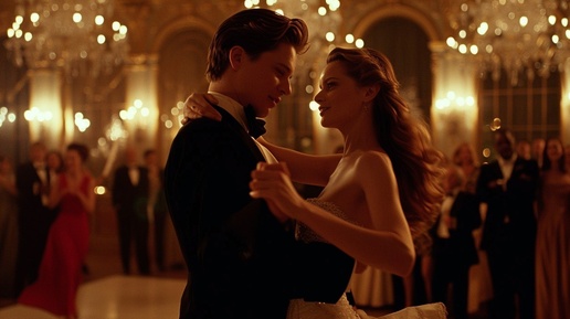 Создано на основе запроса: cinematic, a man in a tuxedo and a woman in a white wedding dress are dancing at their wedding, guests can be