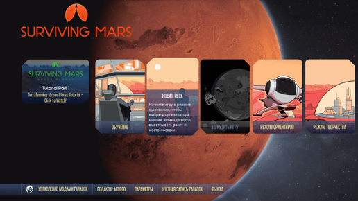 Surviving Mars в Steam. Я и решил поиграть и написать отзыв. Игра запустилась на английском, но в настройках я нашел переключение на русский язык. Играть на английском можно даже не зная его, но играть не комфортно, хотя по значкам можно определится. Типы игры На начальном экране есть: обучение, новая игра, загрузка, режим ориентиров, режим творчества. Теперь по порядку. Обучение Пять этапов обучения, где строится колония с начала (посадки ракеты) до строительства куполов и поселения колонистов...