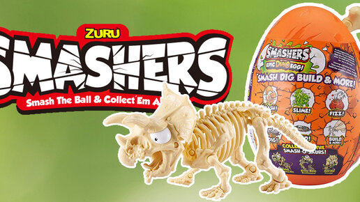 Открываем новинку 3 серии Zuru Smashers Кто из древних рептилий вам больше нравится? Ти-рекс, Брахиозавр или Трицерапторс? Знаем, вы хотите сразу всех, потому что они гигантские, скелетообразные и вместе с ними есть сразу 6 коллекционных динозавриков. А еще у каждого есть возможность изучить 5 природных смесей – болотную тину, твердыню, песок, лаву и лед. Интересно? Гигантское яйцо-упаковка с торчащей из скорлупы костью необходимо разбить, чтобы найти внутри пластиковый большой пакет с изображением динозавров и дино-карту...