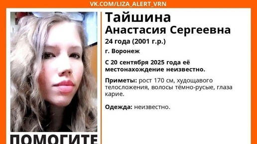 Волонтеры объявили о начале поисков 24-летней девушки, исчезнувшей более двух недель назад в Воронеже. Информация об этом размещена в социальных сетях поискового отряда «Лиза Алерт». Анастасия Тайшина пропала 20 сентября, с тех пор данных о ее местонахождении нет. Ее приметы: рост 170 см, худощавое телосложение, темно-русые волосы, карие глаза...