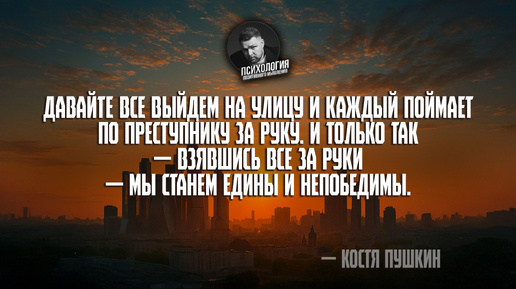 Давайте все выйдем на улицу и каждый поймает по преступнику за руку. И только так — взявшись все за руки — мы станем едины и непобедимы.
