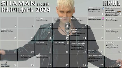 Обновление SHAMANского КАЛЕНДАРЯ на июнь 2024 года. Июнь 2024 года 2 июня. 17:00. Москва. Лужники Футбол. FONBET Кубок России. Суперфинал. "Балтика" (Калининградская область) - "Зенит" (Санкт-Петербург) 2 июня. 17:00. Матч ТВ Прямая трансляция суперфинала Кубка России по футболу 8 июня. 19:00. МУЗ-ТВ Авторадио - 30 лет. Муж Кадышевой заявил, что артистка планирует спеть дуэтом с 𝐒𝐇𝐀𝐌𝐀𝐍 ИЮЛЬ 2024 года ❗️Обновление афиши: 22.07.2024 Сочи 01.07.2024 20:00 Калининград, «Янтарь-Холл» https://artzvezdy...