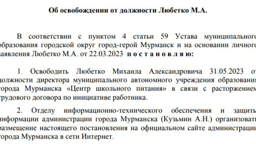 Директор мурманского муниципального Центра школьного питания Михаил Любетко будет освобожден от занимаемой должности начиная с 31 мая 2023 года.