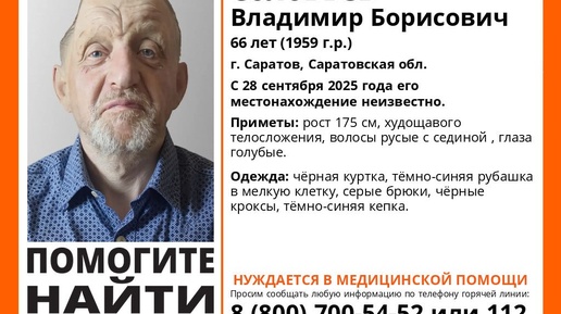 В социальной сети "Вконтакте" отряд "ЛизаАлерт" выложил ориентировку на Владимира Соловьева. 66-летний саратовцев пропал 28 сентября 2025 года.
