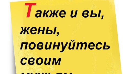 Первое Послание Петра Глава 3 1 Также и вы, жены, повинуйтесь своим мужьям, чтобы те из них, которые не покоряются слову, житием жен своих без слова приобретаемы были, 2 когда увидят ваше чистое, богобоязненное житие. 3 Да будет украшением вашим не внешнее плетение волос, не золотые уборы или нарядность в одежде, 4 но сокровенный сердца человек в нетленной красоте кроткого и молчаливого духа, что драгоценно пред Богом. 5 Так некогда и святые жены, уповавшие на Бога, украшали себя, повинуясь своим мужьям...