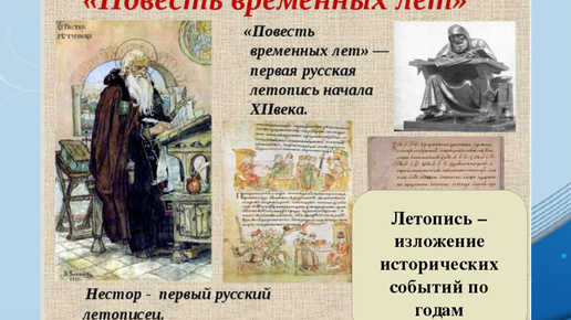 «Повесть временных лет» — выдающийся исторический и литературный памятник, отразивший становление древнерусского государства, его политический и культурный расцвет, а также начавшийся процесс феодального дробления. Созданная в первые десятилетия XII в., «Повесть…» дошла до нас в составе летописных сводов более позднего времени. Самые старшие из них — Лаврентьевская летопись — 1377 г., Ипатьевская, относящаяся к 20-м годам XV в., и Первая Новгородская летопись 30-х годов XIV в. В «Повести временных лет» используются два типа повествования: Погодные записи — содержат сообщения о событиях...