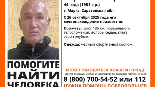 Саратовский поисковый отряд "ЛизаАлерт" разместил ориентировку на 44-летнего мужчину. Рафаиль Сибагатулин из Маркса ушел из дома 26 сентября 2025 года и не вернулся. Где он сейчас - неизвестно.