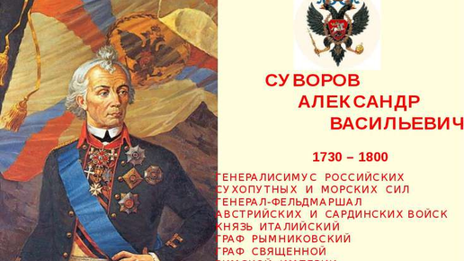 Александр Васильевич Суворов участвовал в шестидесяти трех битвах и не проиграл ни одной. Он был единственным, кто смог дослужиться от младших офицерских чинов (простого капрала) до звания генералиссимуса. Родился 24 ноября 1730 г., Москва. Умер 18 мая 1800 г., Санкт-Петербург. Русский полководец, основоположник русской военной теории. Генерал-фельдмаршал, генералиссимус, генерал-фельдмаршал Священной Римской империи, великий маршал войск пьемонтских, кавалер всех российских орденов своего времени, вручавшихся мужчинам, а также семи иностранных...
