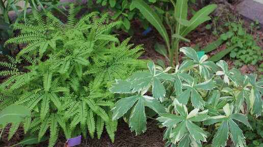 Вы можете поверить в то, что это растение - неприхотливо и устойчиво? Это адиантум стоповидный (Adiantum pedatum). Он бывает видовой - повыше, и сортовой. Мой сорт называется "Imbricatum", считается компактным, но разброс высоты в разных источниках очень значительный: от 15 до 30 см. Мой скорее ближе ко второму значению: 20-25 см высотой. У этого папоротника совершенно потрясающая ажурная листва, которая держится не то что до первых заморозков, а до самых настоящих снегов: Первым снегом адиантум...