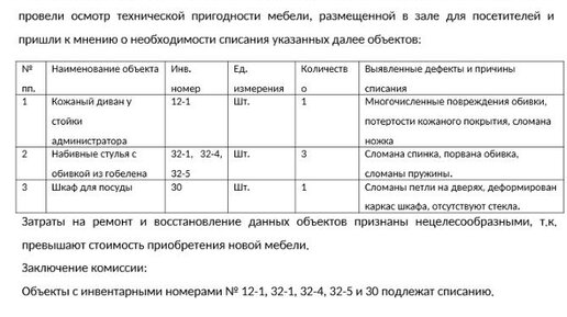 Акт на списание мебели: образец