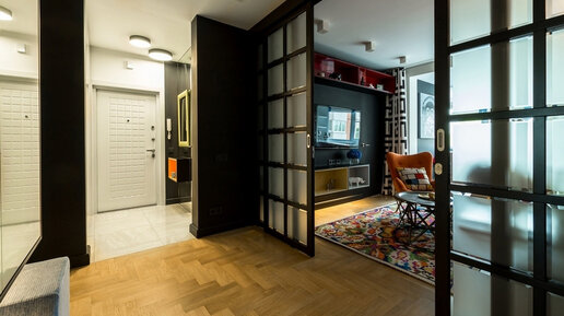 Фотограф: Чернышов Виктор Раздвижные двери из матового стекла с темными переплетами отлично сочетаются с дубовым паркетом и черно-белой палитрой прихожей. Но главное, они вносят в интерьер нотку японского стиля. Автор проекта:...