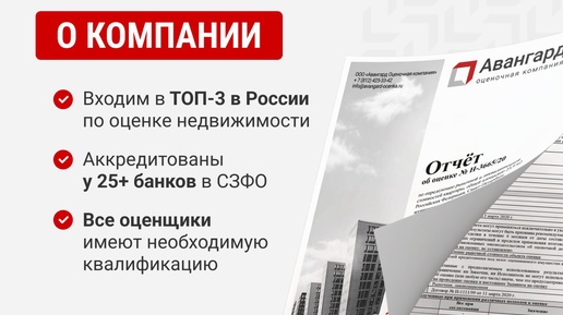 Авангард Оценочная компания 🔸 оказывает полный спектр услуг по оценке рыночной стоимости имущества и проведению строительных экспертиз. С момента основания в 2017 году наша компания выполнила более 120 000 отчетов об оценке, став одним из ключевых аккредитованных партнеров для свыше 25 крупнейших банков Северо-Западного региона: Металлинсвестбанк, Россельхозбанк, Абсолют Банк, Сбербанк (в т.ч. по системе ДомКлик), Газпромбанк, Банк АкБарс, Промсвязьбанк, Банк Уралсиб, Банк Санкт-Петербург, Совкомбанк,...