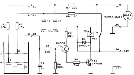 Всем здравствуйте. На рисунке представлена схема простого автомата для управления насосом для откачивания, к примеру грунтовых вод в подвале, где нет канализации. Насос, приведенный на схеме на напряжение питания 24 вольта...