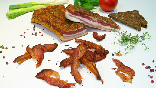 Пошаговый рецепт можно увидеть в этом видео: Настоящий вкус бекона. На чёрном хлебе с лучком. Или жаренный до хруста с яичком на завтрак. Идеален с бургером и картошечкой. Незаменимая закуска на праздничном столе. Никакого сравнения с магазинным. Никакого жидкого дыма, никаких Ешек. Только так и будете готовить. Для приготовления сыровяленого/копченого бекона методом сухой засолки понадобится: Подчеревок /грудинка Посолочная смесь 3 % из расчета 1 кг мяса (30 гр на 1 кг): 15 грамм. Соли морской или каменной ( для посола) 15 грамм...