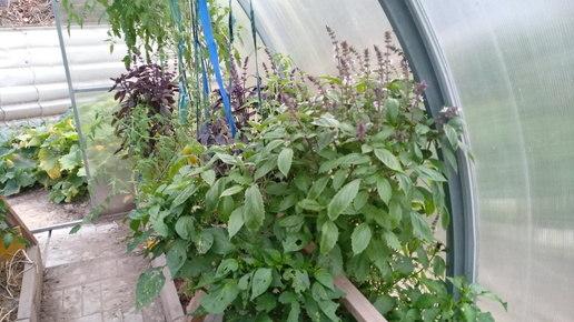 В 2024-м году теплица встречала нас ароматом базилика. К сентябрю кусты разрослись. Их обрываешь-обрываешь, а те становятся пышнее. А цветки какие — залюбуешься. Выращивание зелёного и фиолетового базилика в теплице неслучайно. Растениям отводилась роль защитников от белокрылки и других вредных насекомых. К обилию пряной травы в поликарбонатной теплице приложила руку не только я, но и отец. Каждый весной по отдельности выращивал рассаду овощей, а при пересадке сажал и базилик. Рядом с огурцами раскинула плети и настурция из смеси «Вспышка»...