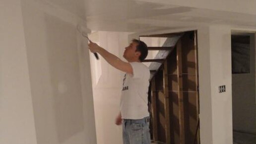 Грунтовка стен перед поклейкой обоев и под покраску наносится валиком – снято на видео