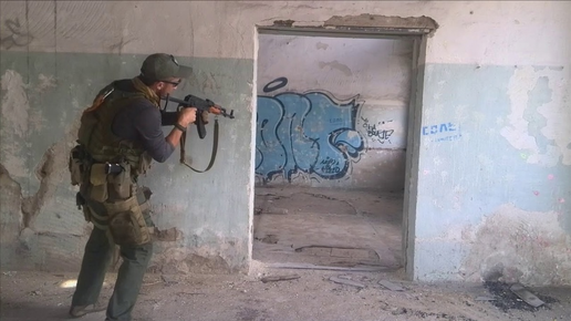 Бой в зале с множеством колонн напоминает бой в лесу, и технология боевых действий при этом та же. Ручные гранаты забрасываются за спины противника, укрывающегося за колоннами, его бойцы плотным огнем прижимаются за укрытия, после чего их поочередно уничтожают – обходят «зажатого» за укрытием индивидуума и расстреливают его с разных сторон. Цели, появляющиеся справа и сверху па дистанциях 10-15 м, уничтожаются «условным способом» из автоматов. Но все же есть в бою в зале свои особенности, которые мы рассмотрели в настоящей коротенькой статье...