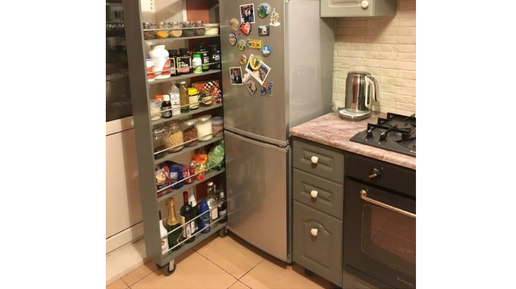 ⠀ Неширокие бутылочницы часто используют в маленьких кухнях между холодильником и духовкой (когда духовку и варочную панель максимально приближают к холодильнику, чтобы увеличить рабочую поверхность, но в то же время необходимо оставить технический зазор до холодильника. Именно бутылочницей такой зазор и заполняют, так как что-то доставать из распашного шкафа шириной 150-200 мм не очень удобно)