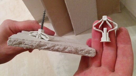 Пока мастер занят укладкой плитки, мне пришлось изучить способы крепления к гипсокартону. Самым надежным креплением показались вот такие пластиковые дюбеля-бабочки. Были закуплены три разных набора и проведены опыты. Суть проблемы: 1) Одна из стен будет облицована кирпичиком 2) Снизу у стены будет плинтус. 3) Крепить плинтус к стене, и от него пускать вверх кирпич? Не вариант, кирпич будет нависать над плинтусом, и стена будет выглядеть неправдоподобно. 4) Крепить плинтус прямо на кирпич? Получится много больших щелей...