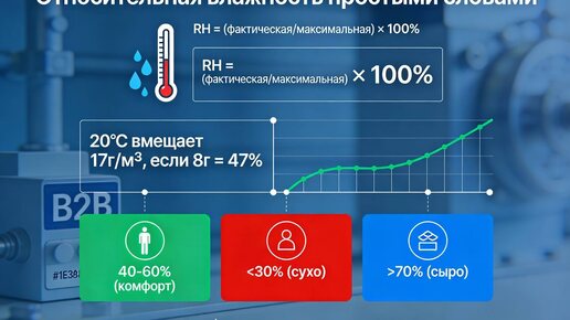 1. Относительная влажность (RH) — основной параметр для дома, выражается в процентах (%). Показывает, сколько влаги содержится в воздухе по сравнению с максимумом, который он может удержать при текущей температуре. Пример: при 20 °C воздух вмещает максимум 17 г воды на 1 м³. Если фактически 8 г — RH = 47 %. Это комфортный уровень для гостиной или спальни. 2. Абсолютная влажность — реальное количество граммов воды на кубический метр воздуха (г/м³). Полезно для расчёта увлажнителей: сколько литров воды в день нужно подать в систему...