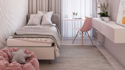 Дизайн детской комнаты 9 кв. м. Нежная и уютная комната для девочки подростка. Дизайн выполнен в пастельных тонах. Дизайнерская люстра и дополнительное освещение в потолке над столом. Стена у кровати выполнена из 3D гипсовых панелей. Дизайн детской комнаты 13 кв...