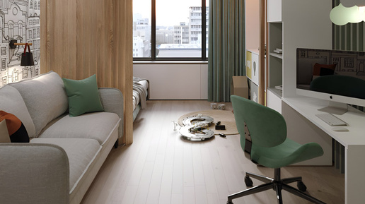Детская комната для двух детей выполнена в светлом дизайне с акцентами на натуральные материалы и светлые цвета. Основная палитра интерьера построена на сочетании светлых оттенков, серой мебели и фактур натурального дерева, а акцентный зеленый цвет добавляет интерьеру живости и энергии. Одна из стен комнаты стала графичным акцентом: на ней изображен черно-белый рисунок города, который добавляет пространству динамики и современности. Эта стена разделена на две части деревянными ламелями, визуально видно зонирование детской комнаты для каждого ребенка...