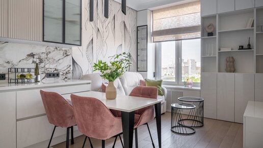 Интерьер евродвушки 38 м² для стильной женщины: нежно-розовые цвета, много воздуха и гардеробная