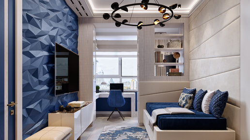 В проектировании комнаты для подростка важным является принцип зонирования. Необходимо грамотно визуально разделить пространство, чтоб удобно расположить рабочую зону, зону отдыха и спортивный уголок, как в нашем проекте. Эргономика играет не последнюю роль, так как комната должна быть максимально удобной для проживания. Выбор цветовой палитры один из важных этапов при создании дизайн-проекта. В данном интерьере создают идеальный тандем бежевый с глубоким синим, подкрепленные акцентами в виде декоративных настенных панелей...