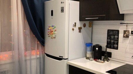 В одной из недавних наших статей про малогабаритные кухни одна из читательниц заметила, что на многих фотографиях отсутствует холодильник. Мы решили исправиться и сделать подборку кухонь площадью 5-6 квадратов, в которые удачно вписан холодильник. На примере ниже удачно сделан подоконник – он не мешает открывать холодильник. Батарея на достаточном расстоянии от прибора. Радиусный гарнитур сводит риск ушибов к минимуму. И подсветка рабочей поверхности – тоже немаловажный плюс. Снова угловая кухня и холодильник у окна...