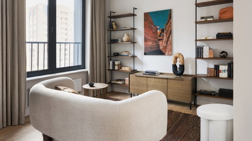 Пожелание заказчиков было выполнить дизайн-проект в пастельных тонах, это обусловило цветовую гамму всех помещений. На стены в гостиной нанесена декоративная штукатурка, причем в зоне тв создана ниша, которая выделена более насыщенным шоколадным цветом. Чтобы подчеркнуть переливы и текстуру штукатурки в таком красивом цвете, дизайнер использовал ряд подвесных светильников, которые будут подчеркивать эффект. В мебели используются максимально натуральные материалы - натуральное дерево, ткани с натуральными волокнами...