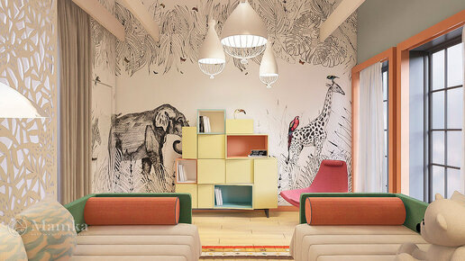 Хотите, чтобы дизайн детской для мальчика и девочки нравился обоим ребятишкам? Тогда вам стоит взять на заметку этот оригинальный проект. Яркий и красочный интерьер буквально пронизан таинственной атмосферой далеких джунглей! Светлую стену украшают огромные изображения мирно прогуливающихся животных...