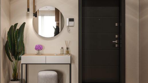 Помещение получилось довольно просторное, отлично поместились два встроенных шкафчика - слева при входе и на против. Отделку дверей у шкафов, по желанию заказчика, сделали зеркальную. Освещение разбили на две группы - это основное (потолочное), и локальное у зеркала. Куда же класть ключи и прочие мелочи, когда заходишь в квартиру? Правильно для этого поставили консоль, с ящичками для хранения и пуфик, ведь босоножки удобнее застегивать сидя на нем...
