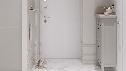 Интерьер прихожей в светлых тонах с плиткой под мрамор