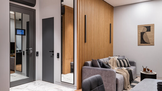 Дизайнер Карине Мхитарян оформила евротрёшку площадью 58 м² для семьи с ребёнком. Заказчики стремились создать современный интерьер без лишних деталей, поэтому избрали концепцию минимализма. Планировка Гостиная Границы зоны отдыха обозначили ковром с геометрическими мотивами. В отделке и мебели избрали нейтральную цветовую гамму: оттенки серого плюс дерево. Стену за диваном отделали реечными панелями, а поверх установили графичные бра. Кухня Гарнитур расположили Г-образно. Плитку на полу пустили только вдоль линии шкафов...