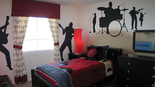 Комната в стиле рок является мечтой любого 13-летнего подростка, вне зависимости от пола и национальности. Да вы и сами, наверняка не раз заглядывались в своей молодости на комнаты героев американских фильмов, сплошь увешенные плакатами и пестрящие черепами и прочей рокерской символикой. Рок - это сила духа, молодость, протест против общественных рамок и стремление выделиться из толпы. Традиционным цветами в стиле рок являются черный и красный. За основу интерьера необязательно брать черный цвет, можно взять глубокий синий или насыщенный фиолетовый...