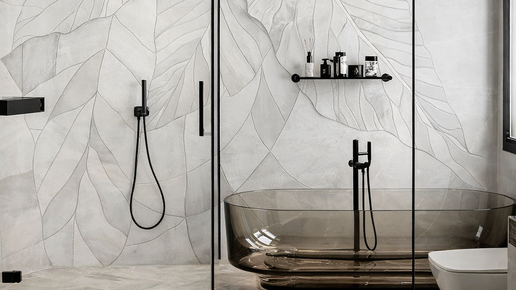 Дизайн ванной с душевой становится всё больше актуальным, так как размеры санузлов позволяют разместить не только ванную, но и душевую кабину одновременно. И хочется объединить визуально эти два пространства, как, например, вот в этом решении. Конечно, отделка душевой кабины очень индивидуальное решение. Ведь каждому приятно проводить время в душе в комфортных условиях и наблюдать и разглядывать панно, которое ему нравится и подходит по цвету, как, например, вот это флористическое панно, флористичное абстрактное панно, напоминающее листья монстер...
