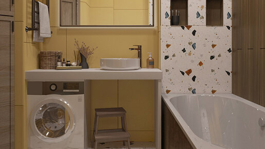 Небольшая по площади ванная комната в которой всё компактно уместилось. Основной цвет желтый, который дает крупная настенная итальянская плитка. Керамогранит под дерево разместили в мокрой зоне ванной комнаты. Структура дерева, как элемент дизайна проходит по всей квартире и тут выделили часть этому элементу...