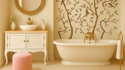 Красивые ванные — это всегда про нюансы. И одна из самых выразительных деталей — панно над ванной. Именно на него падает первый взгляд, оно создаёт настроение и задаёт тон всей комнате. Плитка с рисунком цветов и волшебных птиц в этом интерьере задаёт тон всей композиции. Мягкий зелёный фон, тонкие линии, проработанные детали — всё выглядит как сцена из старинного китайского свитка. Свободно стоящая ванна на золотых ножках перекликается с тёплой фурнитурой и усиливает ощущение королевской роскоши...