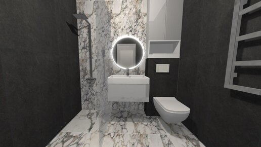 Дизайн-проект ванной комнаты: белый мрамор с активным рисунком