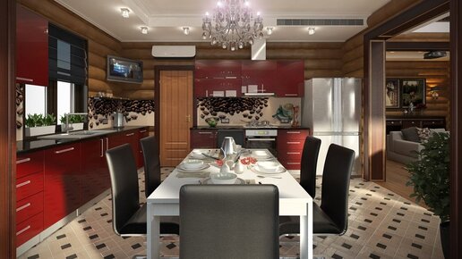 Обилие деревянных вставок (и даже деревянных стен), округлые формы и плавные линии, приглушенные тона – в интерьерах этого частного дома классический модерн приобретает современное и даже чуть более агрессивное звучание благодаря глубоким винным акцентам, черно-белым контрастам в подборе мебели и крупному рисунку на декоративных вставках в кухонном гарнитуре. Дизайн гостиной деревянного дома в стиле модерн На фотографии обстановка гостиной в стиле модерн выглядит особенно оригинально на фоне бревенчатых стен...