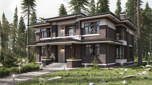 Проект двухэтажного дома в трендовом стиле Райта с террасой, балконом и 4 спальнями, 303 кв.м.