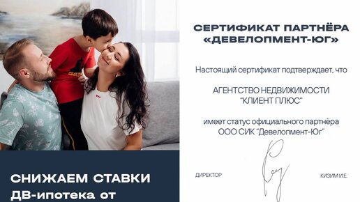 Новость недели! ДВ-ипотека от 0,1% в домах от Девелопмент-Юг! КЛИЕНТ ПЛЮС является официальными партнерами застройщика в регионе. 🔸Расскажем и оформим самую выгодную ипотеку 🔸Проконсультируем покупателей по ЖК Футурист и ЖК Каштановый двор 🔸Ипотечный специалист сделает расчеты по...