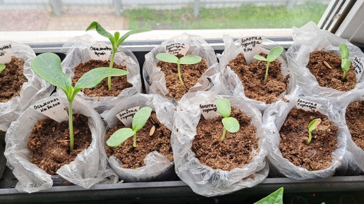 Семена: огурцы 'Темная ночь' и 'Китайский дракон' — по 2 шт., кабачок 'Осьминог ' — 4, кабачок 'Черный красавец' - 6, тыква 'Пабло' — 4, тыква 'Ореховое масло' — 8, тыква 'Руж виф д'Этамс' — 4, дыня 'Золотая торпеда' — 8, дыня 'Солнечный бриз' — 4, дыня 'Комета' — 4.