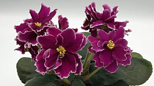 Фиалка ЕК-Дворец Султана Огромные махровые вишнёво-красные цветы с чёткой белой каймой стоят букетом над тёмной выставочной розеткой из простых листьев. Кайма широкая с мягким переходом. Аккуратная не крупная розетка. Стандарт. Сорт беспроблемный в плане формирования розетки. Цветы не гиганты, но качество цветоносов и розетки очень радуют. Положительный во всех отношениях сорт, образцовые цветоносы, много цветов, цвет насыщенный, окраска стойкая, охотное и регулярное цветение. Яркие большие цветы, кайма немного зависима от условиям содержания...