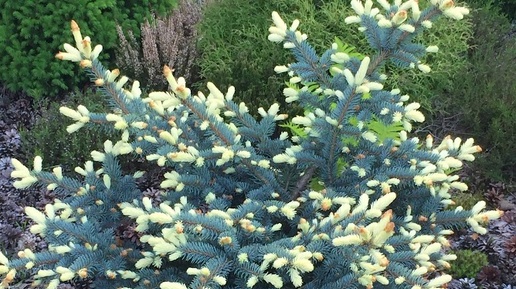 Вот, кажется, уже про все хвойные, посаженные в 2018 году и раньше, я упоминала в статьях или написала отдельный рассказ в подборке "Одно дерево – одна статья". А эта ель оставалась без описания. Похоже, что не очень-то она мне нравится. Ну что ж, пришло и её время. Ель колючая Биалобок Picea pungens Bialobok известна своими яркими сливочными молодыми приростами, которые перецветают постепенно и становятся голубыми. То есть это ель голубоватого цвета, но на небольшое время в начале лета становится очень яркой за счёт вот этих самых бело-сливочных приростов...