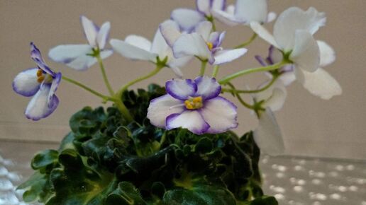 Сегодня я чего-то разошлась в статьях.., так сказать "попёрло" 😁, хочется больше рассказать и показать о своих фиалочках.. Ранее было видео : - фиалки в боксе, мой метод размножения На сегодня это сорт Вальковой Татьяны 2019 года, миниатюрка с гёрл листвой - "Радужная зайчиха" Цветы бело-голубые в форме звезды. Крупноцветковая. Окрас: белый с нежно-голубым центром и разводами. Лист пестрый, края фестончатые. Гёрл листва Меня фиалка привлекла необычным цветочками действительно звездочки с такой я бы сказала гжелевой окраской, которые пархают над крепенькой кудрявый розеточкой...