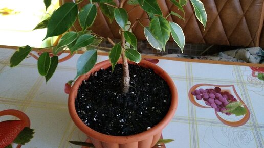Это мой фикус сорта Бафт. У него красивые и яркие листочки. По краям жёлтые, а в середине зеленые. Совсем молоденькие листики могут иметь салатный оттенок, но потом превращаются в обычные зеленые с жёлтой окантовкой свойственной сорту Бафт. Этот экземплярчик у меня около года, но это не годовалое растение. Сколько ему лет я не знаю, не спрашивала. Возможно, что около 3-х лет. Высотой он 33 сантиметра без горшка. Пересадила его недавно (в марте месяце) в горшок побольше. В этом литраже он будет сидеть не менее года точно...