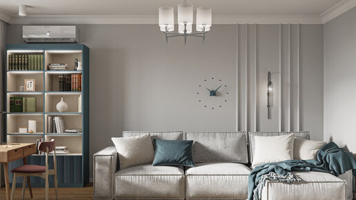Передо мной стояла задача сделать светлую гостиную с удобным угловым диваном и зоной ТВ, а также разместить в ней место для домашней работы. Комната имеет балкон , ее окна выходят на север, поэтому освещение дневным светом довольно скудное. Чтобы решить это вопрос, было решено развернуть стол к окну. Шкафы разработаны специально для этого проекта, и размещены симметрично по краям от стола...