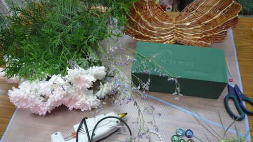 Сегодня я решила сделать подарок своей подруге. Жемчужину из живых хризантем. Что для этого нужно: Начинать декорировать жемчужину лучше с центрального цветка, а потом спускаться по спирали вниз. Черенки у цветов оставить 4-5 сантиметров. Чтобы удобнее было делать шарообразную форму. И чтобы было, за что держать цветок. Затем приклеиваем бусины в центры цветов. Клей можно использовать флористический, клеевой пистолет или типа "Момент". Для того чтобы верхняя створка ракушки не лежала на цветах, сверху втыкаем бамбуковую палочку...
