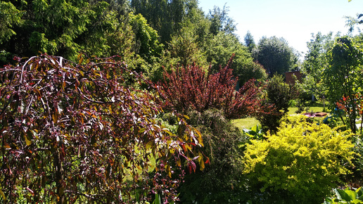 Эта яблоня на штамбе была посажена давно, больше пятнадцати лет назад точно. За это время она стала немного выше, но и сейчас не достигает двух метров. Длину веток пришлось укорачивать уже неоднократно, как и те, что направлены вверх. Ширина дерева тоже увеличилась, но не критично. Место, подобранное для неё, пока по-прежнему подходит для сегодняшних габаритов. Листочки яблони самые яркие во время роспуска весной. Довольно быстро после достижения своих размеров они начинают постепенно зеленеть...